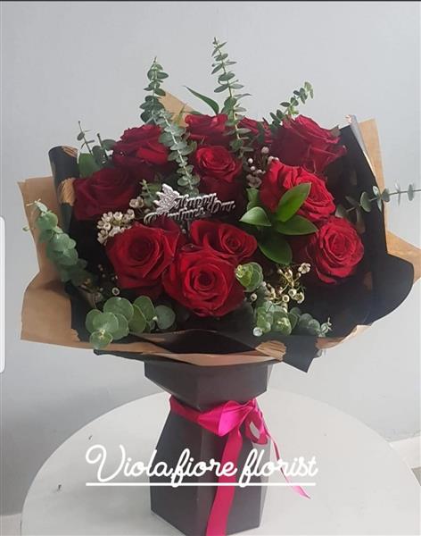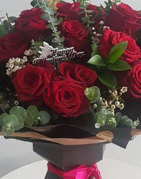 Suprise someone with this Elegant,Twelve best red Rosa's and eucalyptus bouquet. Beautiful flowers handtied in water and presented in a black floral gift box.