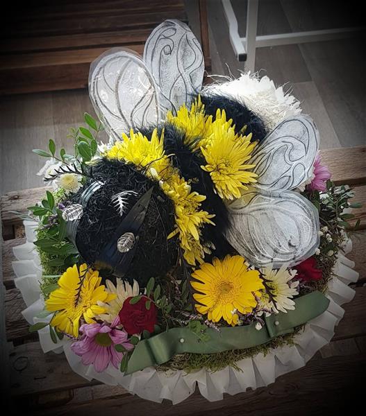 Handcarved bumblebee. Using florist oasis.