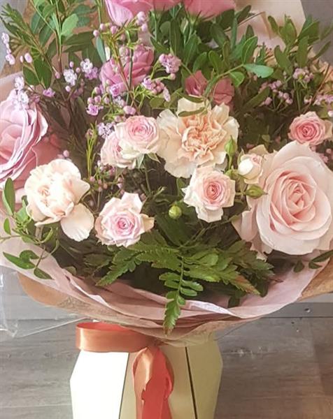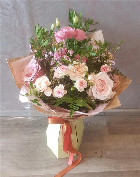 Beautiful seasonal flowers in tones of pink, includes Rose's, pink carnations, Alstromeria and lisianthus. flowers are handtied in water and presented in a floral gift box for instant display . suitable for a number of occasions including Birthdays or Anniversary. this bouquet is available in multiple sizes.