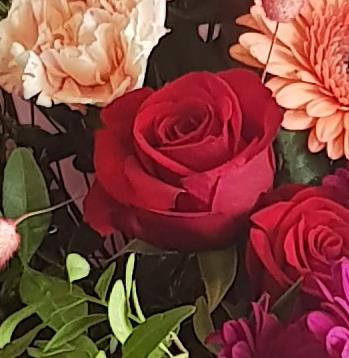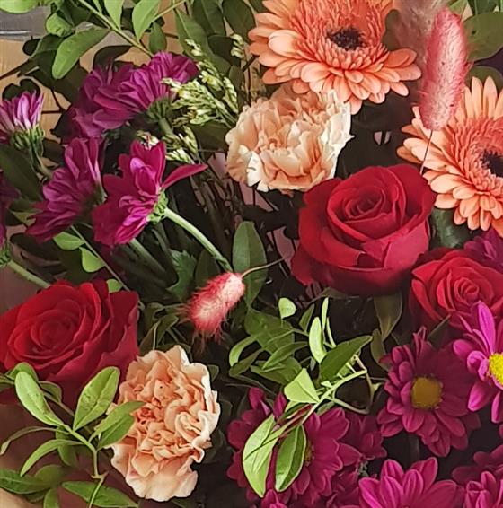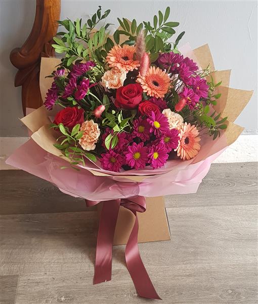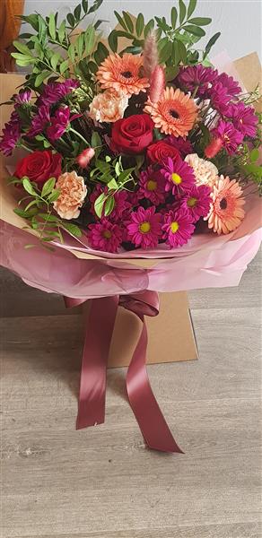Autumnal seasonal bouquet available for same day delivery. A vibrant autumn mix featuring cerise chrysanthemums, coral gerbera, classic red roses and peach carnations, surrounded by fresh greenery and soft dried grasses. The blend of warm and bright tones makes this bouquet full of life and texture.