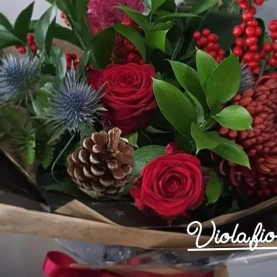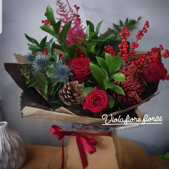 Red berry, Rich red Rose's, thistle, chrysanthemums bloom and Astilbe, blue spruce and mixed foliage.