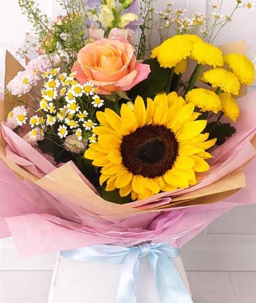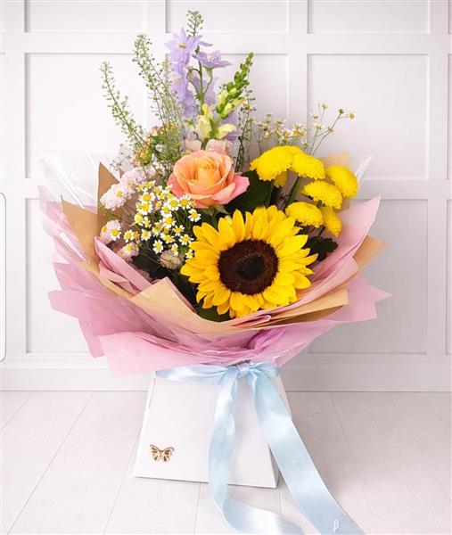 A delightful little gift using vibrant in season flowers, featuring a beautiful sunflower ,rose and filler flowers .handtied in water flowers are presented in a floral gift box for instant display on arrival. Comes with a free message card and satin ribbon bow.