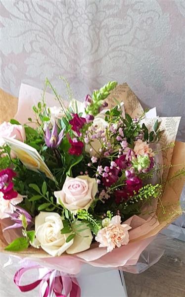 Blush pink Rose's with burgandy antirrhinum and pink carnation are handtied in water for instant display on arrival. Suitable for multiple occasions.