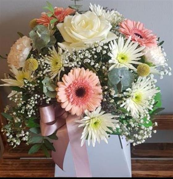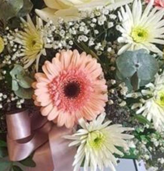 Germini daisy arranged with gypsophylla, chrysanthemums and carnations,flowers are arranged in floral oasis for instant display. The design is finished with a satin ribbon bow.