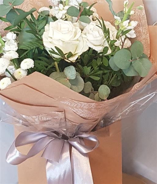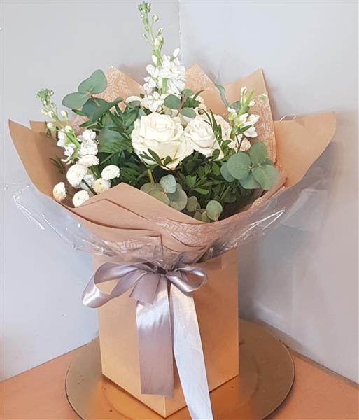 Elegance-white rose and Stock luxury handtied bouquet  zoom 2Elegance-white rose and Stock luxury handtied bouquet  zoom 3
