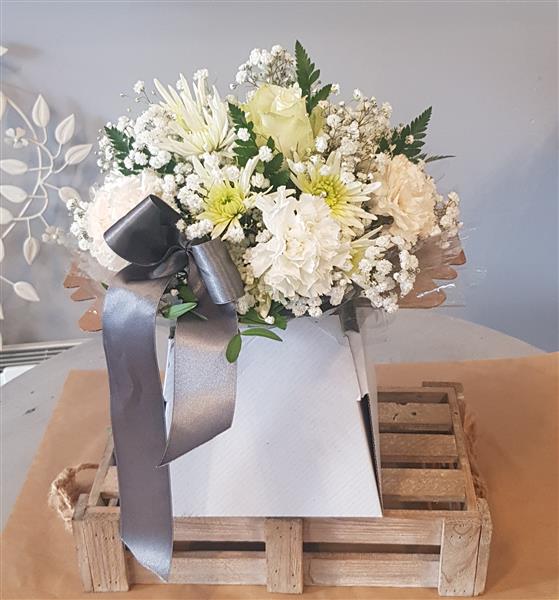 Beautiful in season flowers in neutral tones, featuring Rose's, carnation, white germini ,Alstroemeria and chrysanthemums,flowers are arranged with fresh greenery in florist oasis for instant display on arrival.