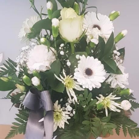A symmetrical tall arrangement featuring white seasonal flowers. Featuring white carnation, white germini daisy , Rose's and chrysanthemums.