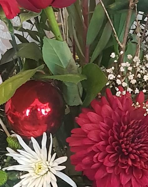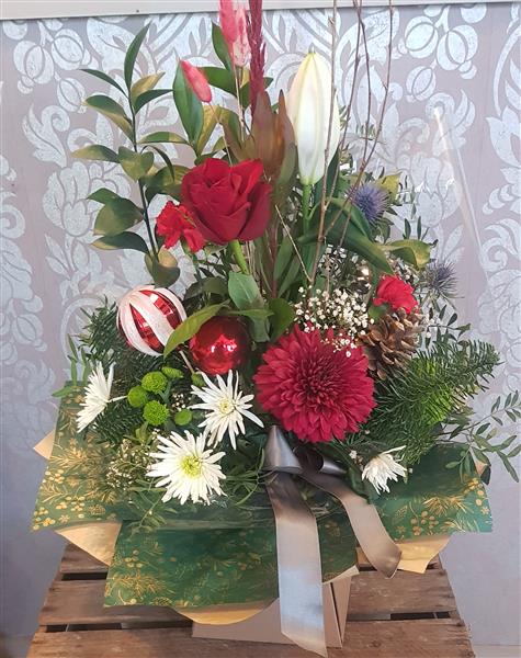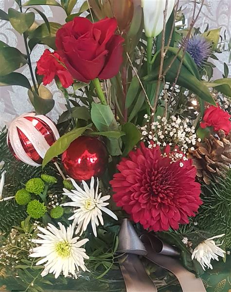 Festive floral arrangement featuring seasonal florals, includes red rose ,carnations, chrysanthemums, gypsophylla, dried grasses, fresh foliages and a festive embelishments pine cone and an xmas bauble. Flowers are arranged in florist oasis .