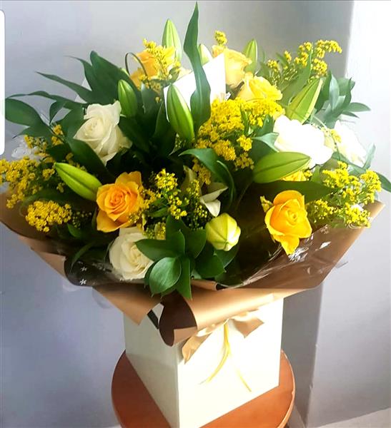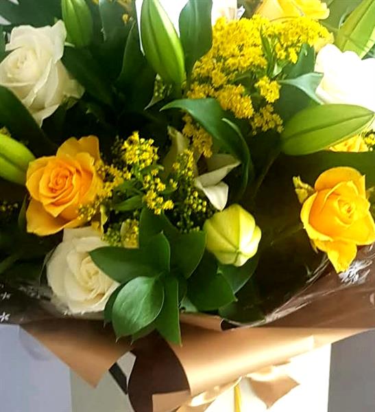 Send your congratulations with this Beautiful bouquet featuring yellow Rose's and classic white lily.accompanied by bright yellow solidago and fresh greenery. This beautiful bouquet is hantied in water and available for various occasions including Anniversary cheer.