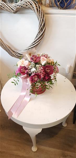 A beautiful arrangement in a keepsake hatbox, includes pink Orchid ,Roses ,dianthus, nestled inbetween beautiful complimentary foliages. Flowers are arranged in florist oasis and are ready for instant display.