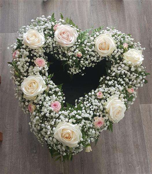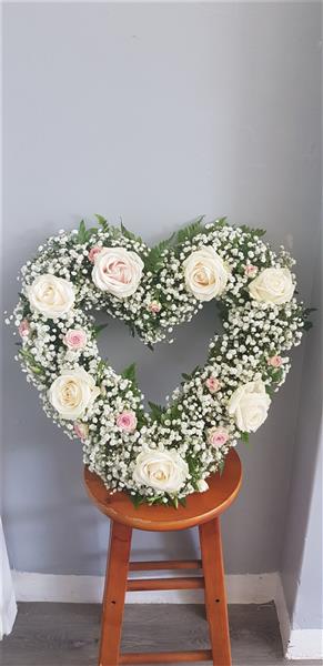 A beautiful heart tribute made with Gypsophylla and Roses .