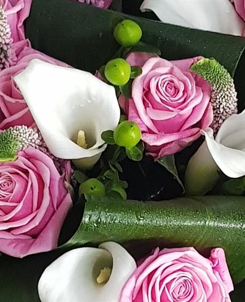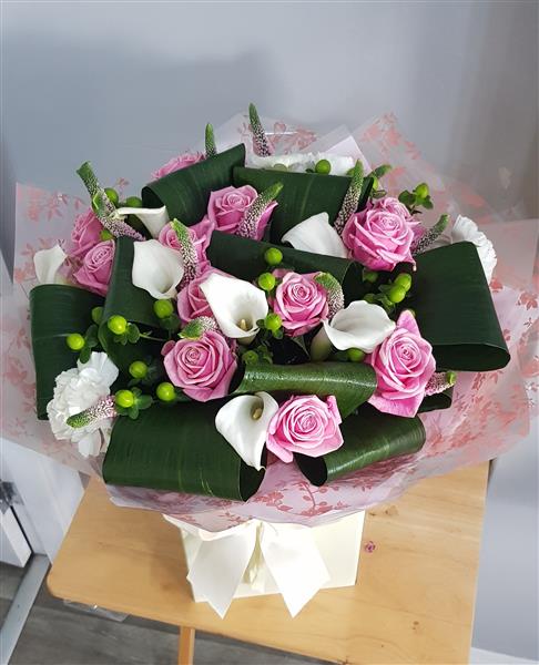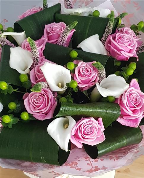 Beautiful ivory calla lily and pink Rosa's are handtied with green hypericum berry, rolled Aspidistra leaf and fresh greenery. This luxury bouquet is handtied in water and presented in a floral gift box for instant display.
