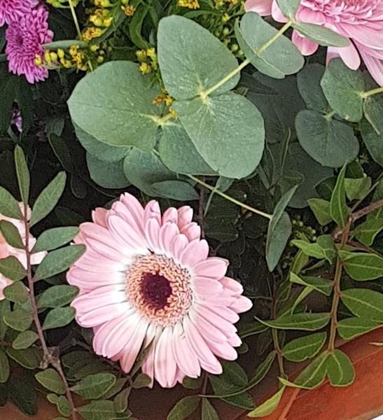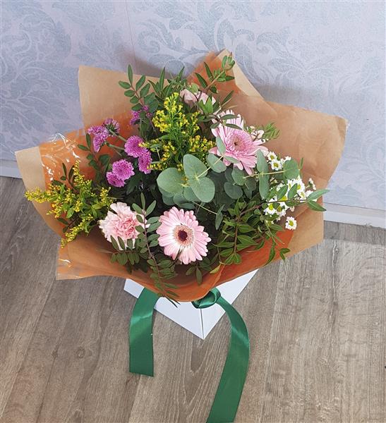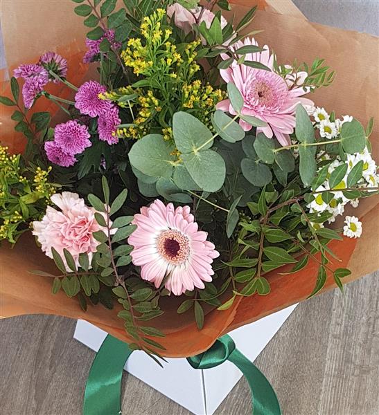 Pretty garden style mix with pink Gerbera, suitable for multiple occasions. Flowers are handtied in water and presented in a floral gift box for instant display.
