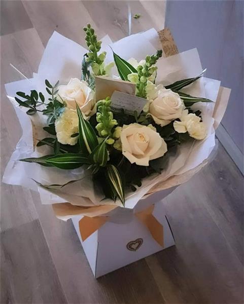 A timeless display of ivory roses, carnations and lush green foliage, finished with a touch of variegated leaves. Classic and elegant, perfect for any occasion. Beautifully wrapped, available in multiple size options.