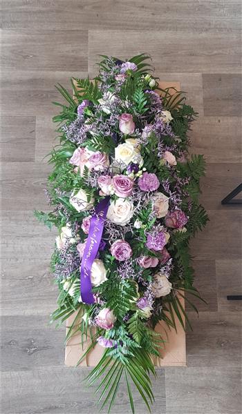 Beautiful floral coffin spray in lilac and purple, includes roses.