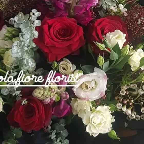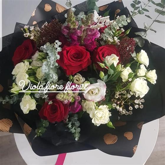 Beautiful velvety red Naomi Rosa's handtied with stunning white porcelain spray Rose's, dark red Antirrinhum, eucalyptus, wax flower and filler foliage's. Flowers are handtied in water ready for you to enjoy