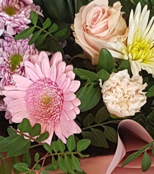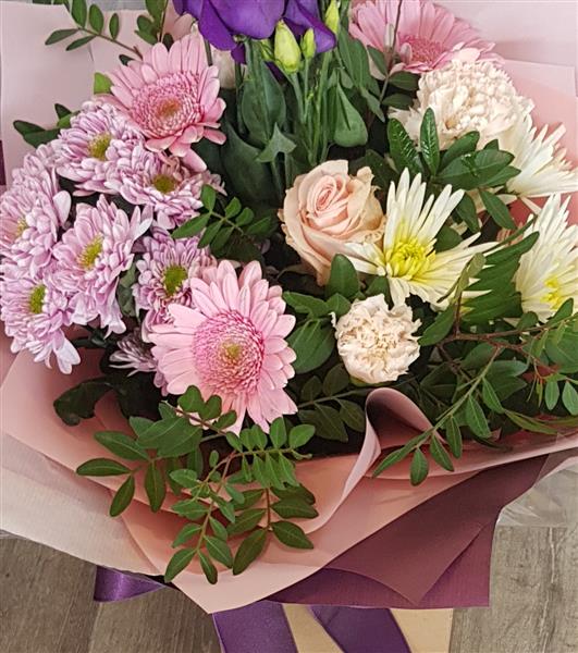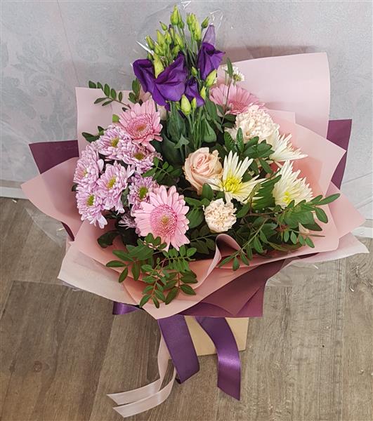 Seasonal flowers in beautiful colours of purple ,pink and ivory. Flowers are handtied in water and presented in a floral gift box for instant display on arrival. Suitable for multiple occasions