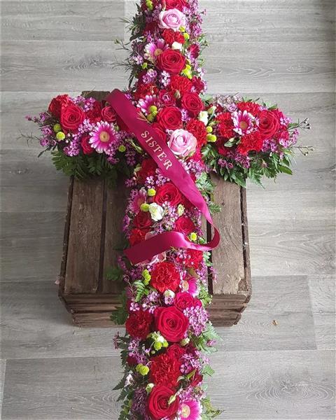 4ft tribute cross in mixed red and pink flowers, named ribbon optional please choose in drop down options.