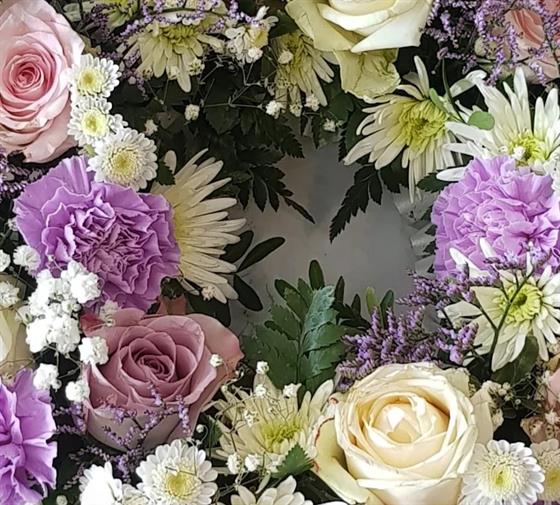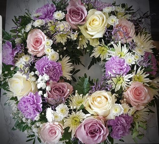 A beautiful selection of Rosa's carnations and chrysanthemums arranged into a floral tribute wreath