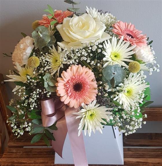 A light and airy mix of soft gerbera, roses, chrysanthemums, and eucalyptus. Fresh, elegant and full of natural beauty, this floral arrangement arrives in florist oasis, ready to enjoy. Same-day delivery available.