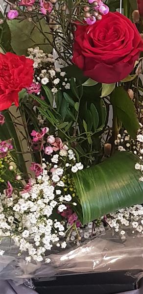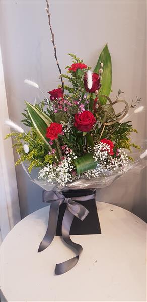Beautiful red rose and carnation with fresh seasonal foliages. Arranged in floral oasis the design features three best red Rose's,three Carnations, smaller filler flowers and fresh greenery. Ready to display on arrival.
