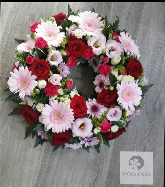 A beautiful mixed flower wreath combining soft pink and deep red tones with gerberas, roses, and lisianthus. A thoughtful and elegant tribute to express heartfelt love and remembrance.
