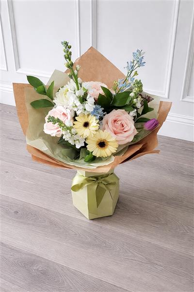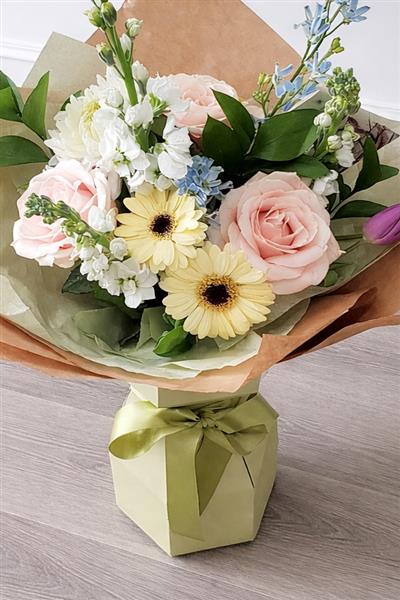 Pretty seasonal flowers in pastel colours, flowers are handtied in water and presented in a floral gift box for instant display.