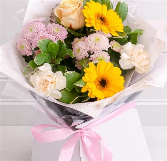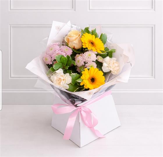 A small but thoughtful gesture, this pretty boxed bouquet features colourful mixed flowers . Flowers are handtied in water and presented in a floral gift box for instant display.