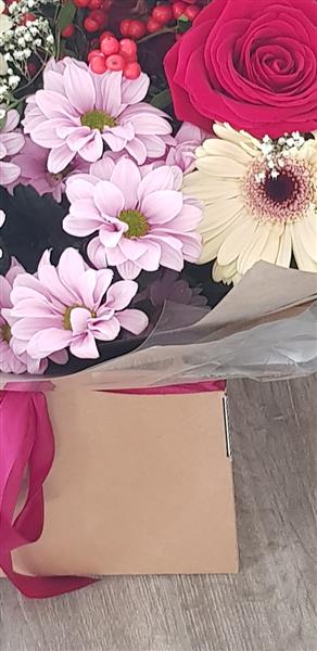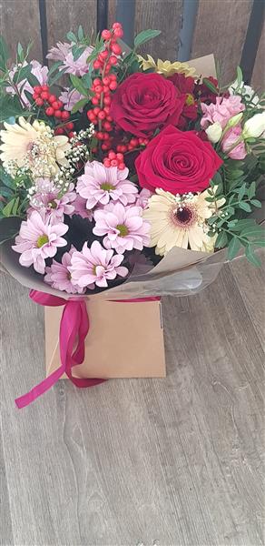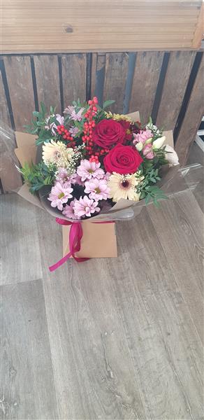 Seasonal flowers in tones of pink, red and cream. Featuring red rose, pink chrysanthemums, ilex berry, gypsophylla, Pink Eustomas and fresh foliages. Flowers are handtied in water and presented in a floral gift box for instant display.