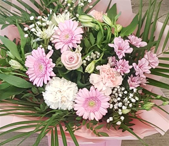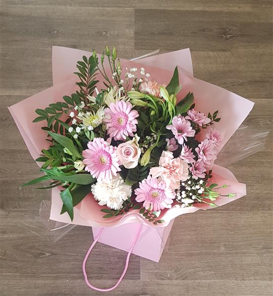 Pretty pink seasonal flowers handtied and presented in a water bubble and complimentary gift bag. Featuring pink carnations, germini daisy, chrysanthemums and Alstroemeria. Pefect for birthday celebrations.Anniversary or just because