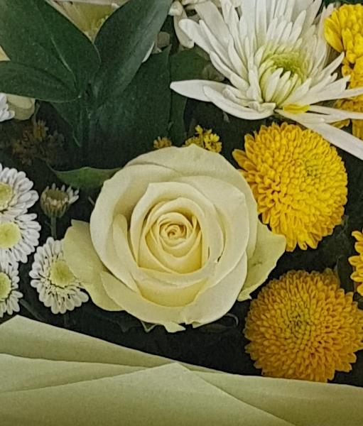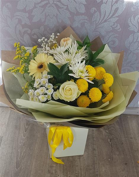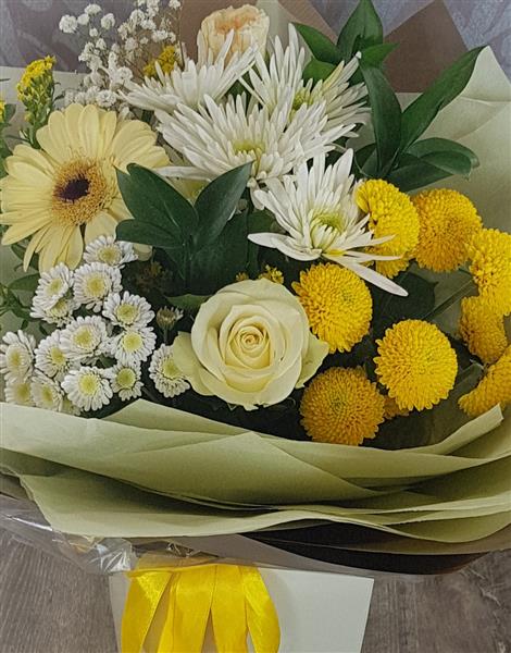 A bright hand-tied in cheerful yellows and ivory with gerbera, roses, spray chrysanthemums, santini, solidago and fresh foliage. Presented in water with ribbon for easy gifting. Order online for local delivery, same day available.