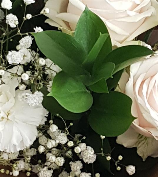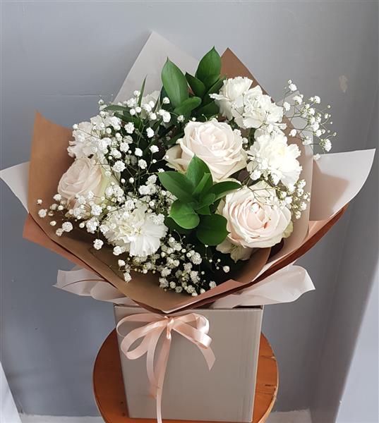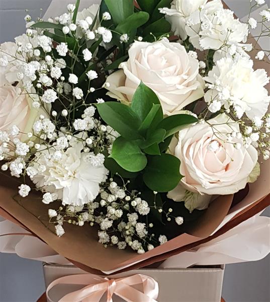 A beautiful selection of seasonal flowers in neutral tones including white classic carnation, ivory Rose's and gypsophylla.The flowers are handtied in water and presented in a floral gift box for instant display.
