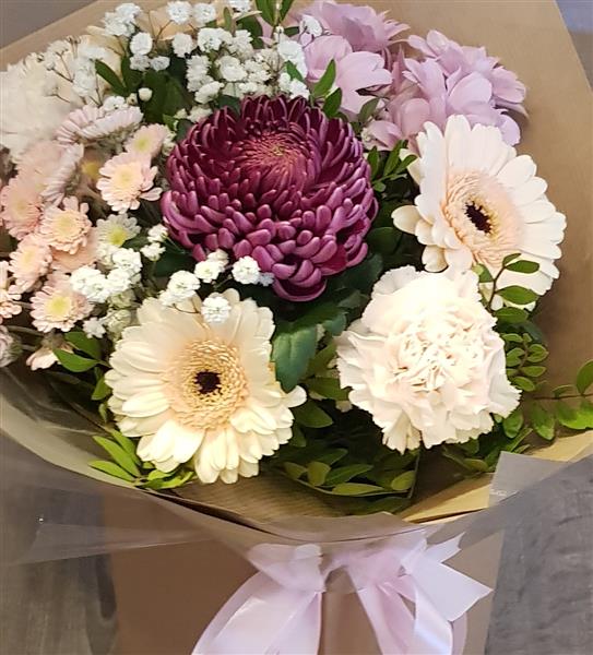 Stunning neutral florals with a touch of burgundy, featuring germini daisy, stylish santini chrysanthemums, beautiful chrysanthemums bloom and airy gypsophila, flowers are handtied in water and presented in a floral gift box for instant display on arrival. Suitable for multiple occasions.