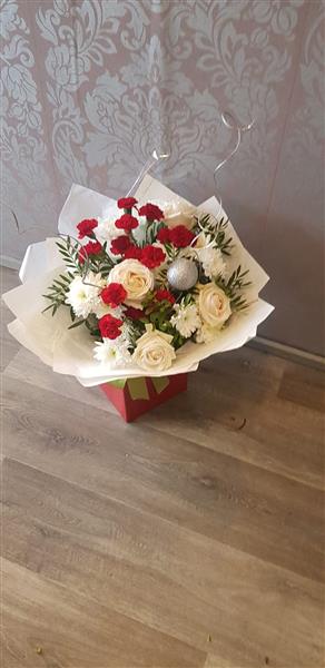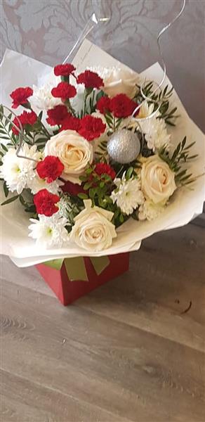 Red and white seasonal flowers featuring roses, chrysanthemums and red spray carnations. Flowers are handtied in water and presented in a floral gift box for instant display.