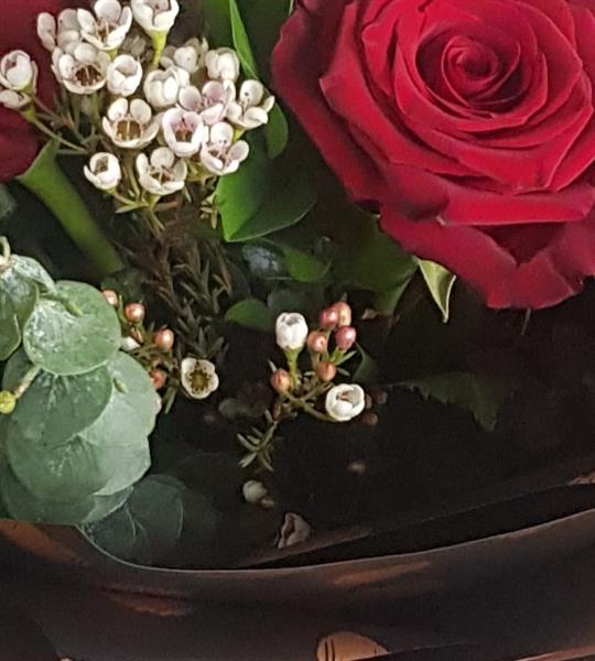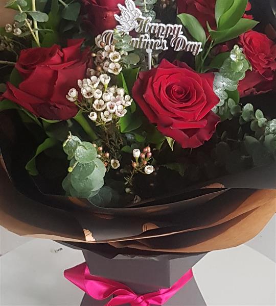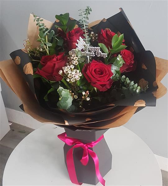 Six best red Rose's arranged with fresh greenery and soft gypsophylla. Make them smile with this beautiful bouquet gift . Flowers are handtied in water and presented in a floral gift box for instant display on arrival.