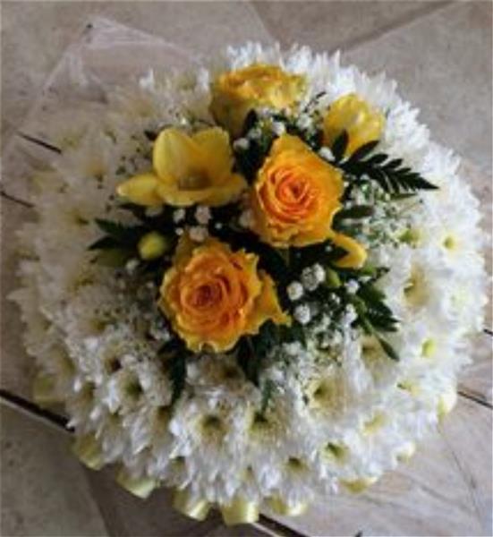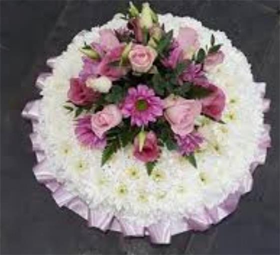 Round traditionally based posy pad, with a colourful spray of flowers to the centre.