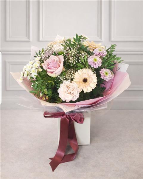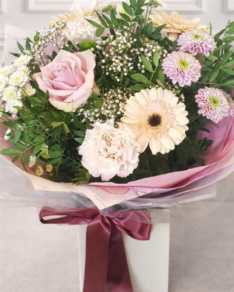 Pretty in season flowers in light pastel shades. Features santini, rose ,Germinis ,dianthus, accompanied by fresh filler flowers and foliages. Flowers are handtied in water and presented in a floral gift box for instant display.