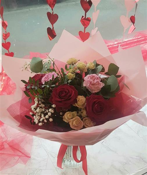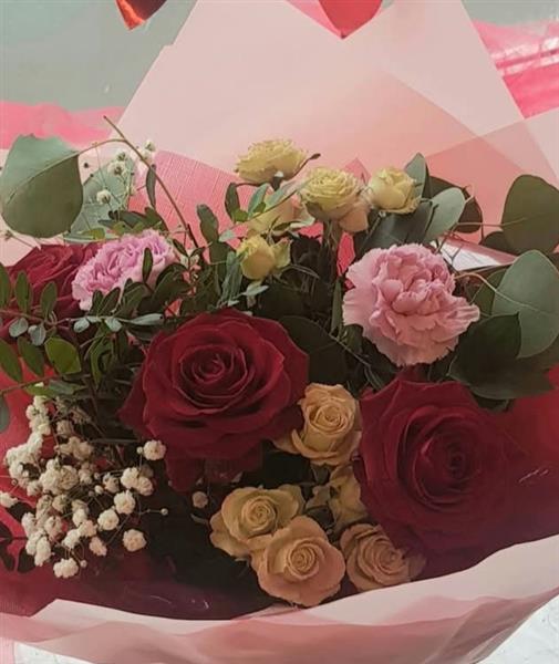 Send love with beautiful handtied flowers from viola Fiore florist, featuring Red Rose's ,pink and white spray rose, pink dianthus, Eucalyptus and small dashes of gypsophylla. This beautiful handtied bouquet is presented in pink decorative wrap and tied with a satin ribbon bow. Flowers are ready to be placed into a vase on their arrival.