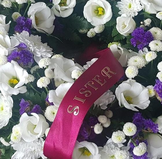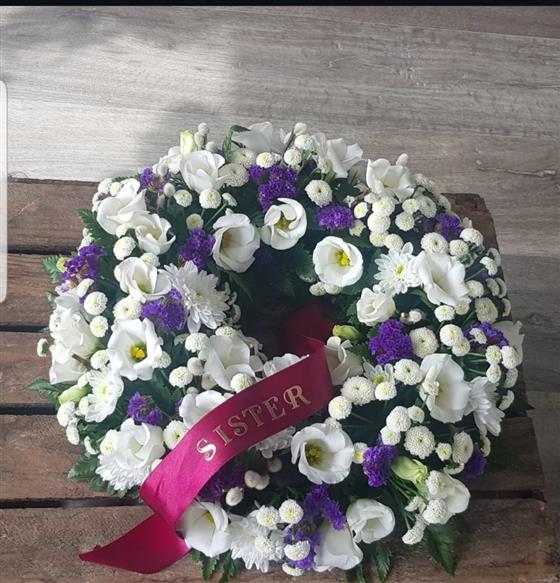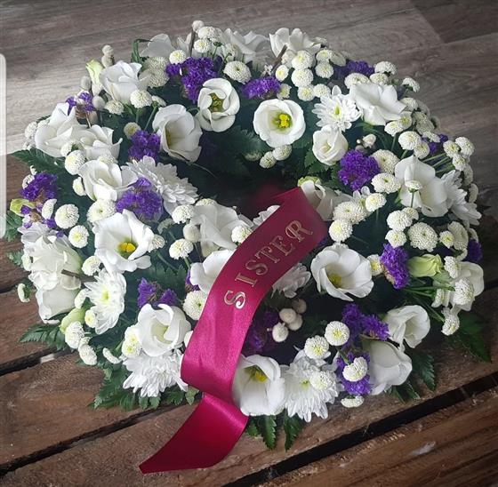 A classic circular wreath made with white and purple flowers, featuring a ribbon and any word, name. A graceful floral tribute to express love and remembrance.