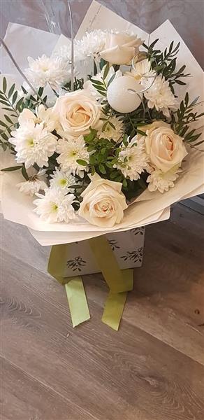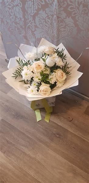 Seasonal flowers in neutral whites and cream featuring gypsophylla, ivory Rose's. and chrysanthemums. Flowers are handtied in water.