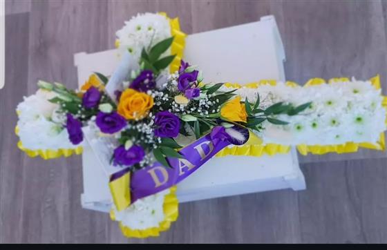 3ft cross massed with chrysanthemums with a yellow and purple central spray