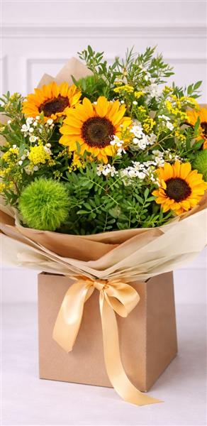 Bold bright premium sunflowers handtied with complimentary filler flowers and foliages, sure to raise a smile and brighten your day this bouquet is handtied in water and presented in a floral gift box for instant display.